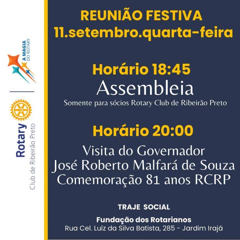 Em 11 de setembro, realizamos a Assembléia dos Associados com o Governador José Roberto Malfará, apresentando e discutindo as estratégias do Distrito 4.540 e também do clube, para o ano Rotário 2024-25. Simultaneamente, as Damas da Casa da Amizade, receberam a Coordenadora das Casas da Amizade, Renata Ferreira da Silva, além da posse da Juliana Gugelmim. No salão principal da Fundação dos Rotarianos de Ribeirão Preto, recebemos o Governador, muitos convidados e o casal Renata e Vicente Gonçalves Martins. Ingressou nesta data como associado do nosso clube, o Ricardo Christovam Borges e na Casa da Amizade sua esposa Thais Pereira Vasconcellos Borges. Festejamos os 81 anos do clube que serão completados no dia 13 de setembro, e após o jantar preparado pelo Buffet Splendido, um bolo maravilhoso de frutas.