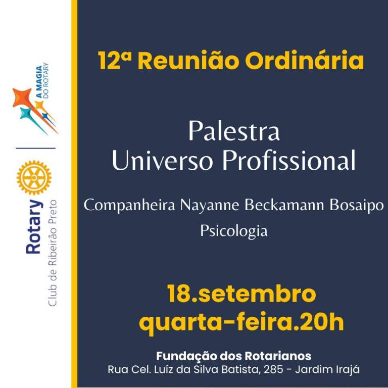 Em 18 de setembro foi apresentada aos associados e convidados, a Palestra "Universo Profissional" Nayanne Beckmann Bosaipo - Psicologia. Em sua apresentação ela nos contou detalhes da sua formação acadêmica, os trabalhos realizados na universidade e os títulos alcançados. Na área profissional relatou uma visão geral do seu trabalho, e ao final atendeu a diversas perguntas. De acordo com o CV Lattes, Doutora em Ciências (área de concentração: Saúde Mental) pela Faculdade de Medicina de Ribeirão Preto da Universidade de São Paulo (FMRP-USP) e Mestre em Ciências (área de concentração: Psicobiologia) pela Faculdade de Filosofia Ciências e Letras de Ribeirão Preto (FFCLRP-USP). Especialista em Neuropsicologia e Graduada em Psicologia (Bacharelado, Licenciatura e Formação de Psicólogo) pela Universidade Federal de Uberlândia (UFU). Título de especialista em Psicologia Clínica pelo Conselho Federal de Psicologia (CFP). Atualmente é neuropsicóloga do Setor de Distúrbios do Movimento e Neurologia Comportamental no Departamento de Neurociências e Ciências do Comportamento do Hospital das Clínicas da FMRP-USP.