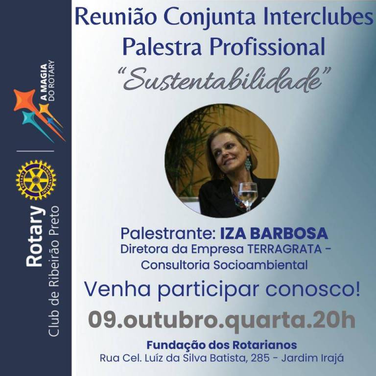 No dia 09/10/2024, na Fundação dos Rotarianos de Ribeirão Preto aconteceu a Palestra Profissional "Sustentabilidade", com Iza Barbosa - Diretora da Empresa Terra Grata, Consultoria Socioambiental.